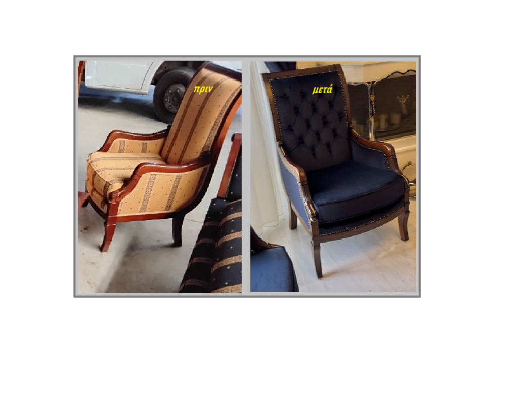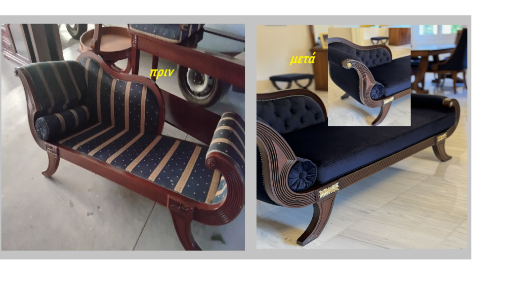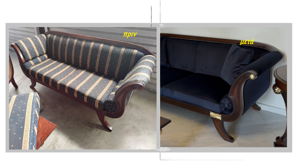 Παλιός καναπές προς αναπαλαίωση. Ο ίδιος καναπές μετά την αναπαλαίωση.